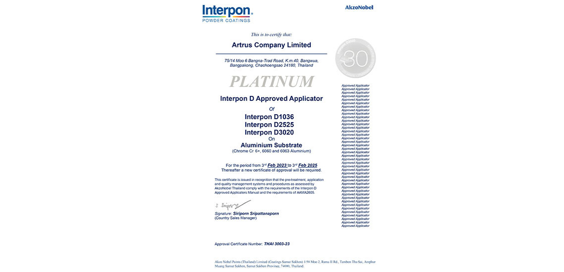 บริษัท อาร์ทรัส จำกัด ได้รับการรับรองมาตรฐานคุณภาพจากบริษัทสีผงชั้นนำของโลกหลายแบรนด์ โดยในวันที่ 3 กุมภาพันธ์ 2023 ทางบริษัท อั๊คโซ่ โนเบล เพ้นท์ส (ประเทศไทย) จำกัด ได้ทำการต่ออายุ Certificate of Approval รับรองมาตรฐานการผลิตของบริษัทฯในเกรดสี Interpon D1036 D2525 และ D3020 เพื่อยืนยันถึงกระบวนการเคลือบสีที่มีคุณภาพและได้มาตรฐาน